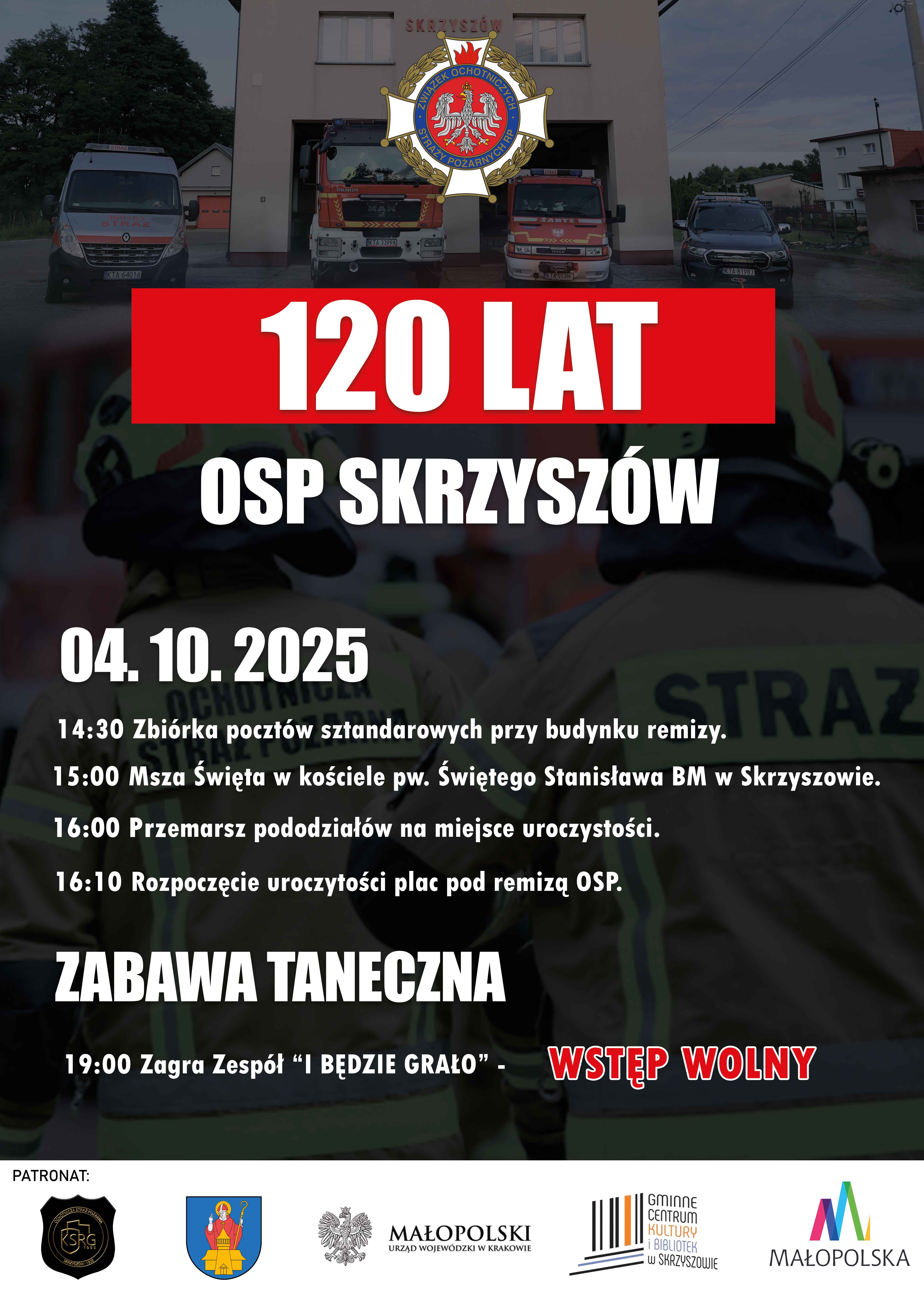 Chcemy zaprosić wszystkich mieszkańców Skrzyszowa i okolicznych miejscowości na wydarzenie które niebawem się odbędzie. 120 lecie Naszej jednostki to święto Naszych strażaków, ale też całej społeczności. Serdecznie zapraszamy w sobotę 4 Października 2025 roku. Już od godziny 15:00 w Kościele Parafialnym w Skrzyszowie. Następnie udamy się na plac pod Naszą jednostką gdzie odbęda się dalsze uroczystości.